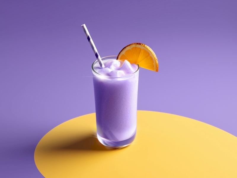 Mixez la banane, le yaourt, le lait de coco et la poudre d’Ube jusqu’à texture onctueuse.