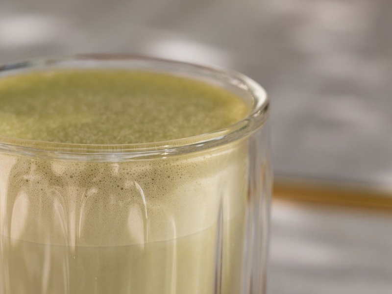 - Versez le lait sur le matcha et fouettez légèrement pour obtenir un latte onctueux.